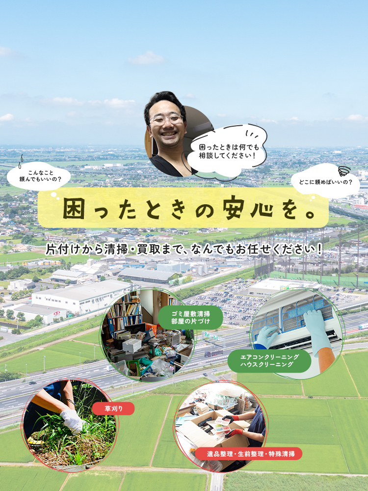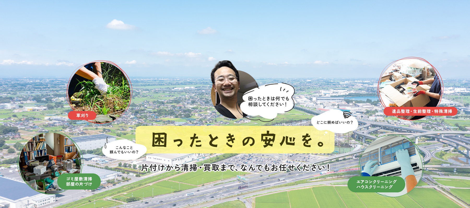 便利屋まちのあかりは、白岡市を拠点に関東全域で、ゴミ屋敷の片付けや遺品整理、ハウスクリーニング、草刈り、買い物や犬の散歩などの日常のお手伝いまで、幅広くサポートしています。「どんなことをお願いできるの?」と思ったら、ぜひ下のボタンからサービス内容をチェック!